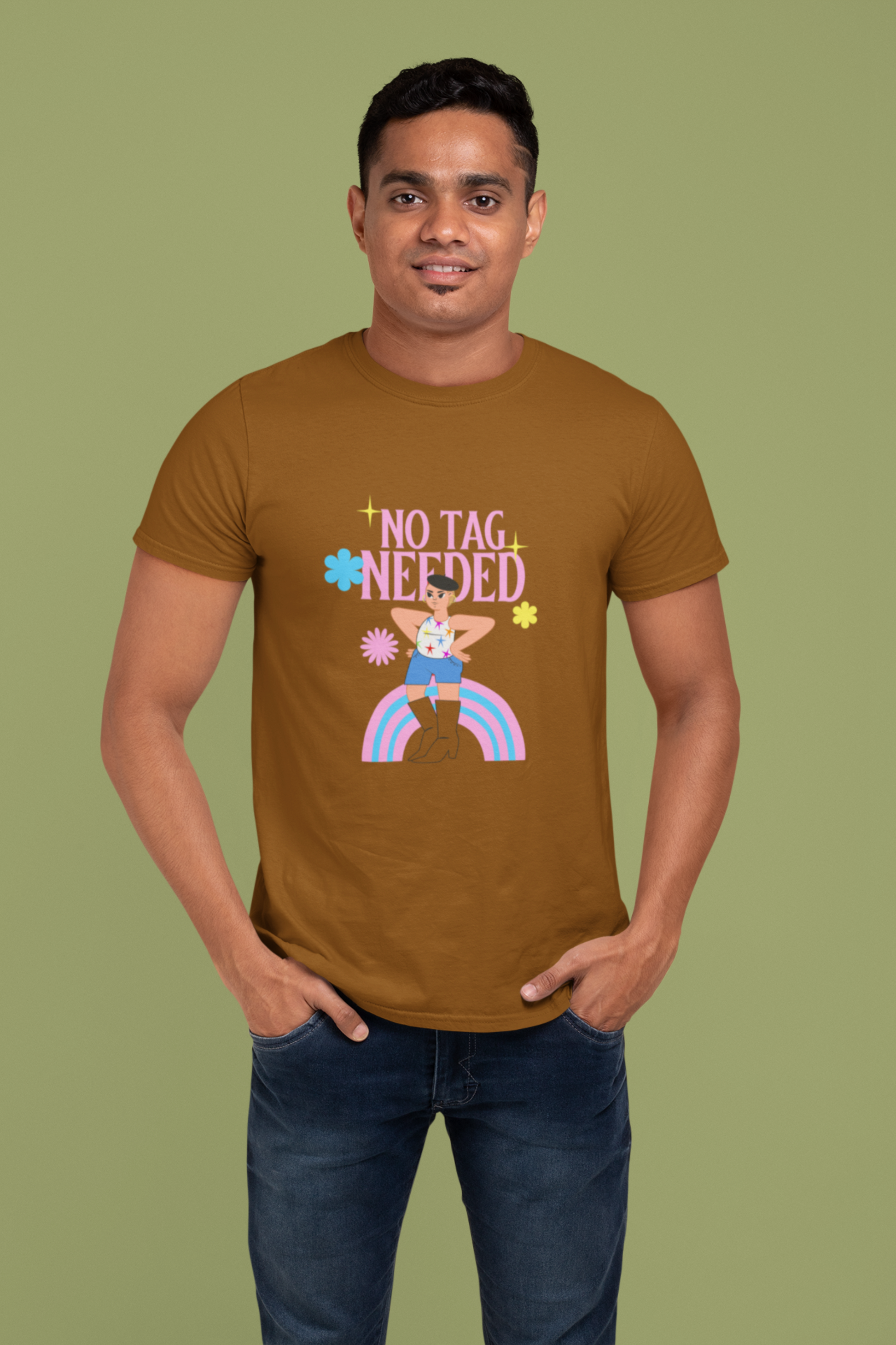 Men’s Pride T-Shirt – “No Tag Needed” LGBTQ+ Design | Pink & Blue Rainbow | 180 GSM Cotton Blend | Eco-Friendly Print | Unisex Fit | Made in India