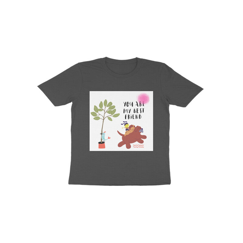 Dress your little one in this adorable t-shirt featuring a heartwarming 'You are my best friend' design with charming illustrations. Crafted from premium 100% combed cotton, this 180 GSM bio-washed fabric ensures maximum comfort for your toddler's delicate skin. The t-shirt sports a regular unisex fit with side seams for durability. The printing is done using water-based, toxin-free inks that maintain their vibrancy through multiple washes. The pre-shrunk fabric helps maintain the t-shirt's shape and size. Available in multiple sizes, this t-shirt pairs perfectly with jeans or shorts for everyday wear. The single jersey knit construction provides breathability and comfort, making it suitable for all-day wear.